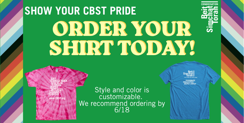 Pride is such a special time at CBST. Join our passionate, provocative, and deeply Jewish community for services, gatherings, and celebrating the whole month long. Read on, too, to share Pride Shout Outs in CBST’s print and digital materials during Pride month, and to order your own CBST Pride shirt.